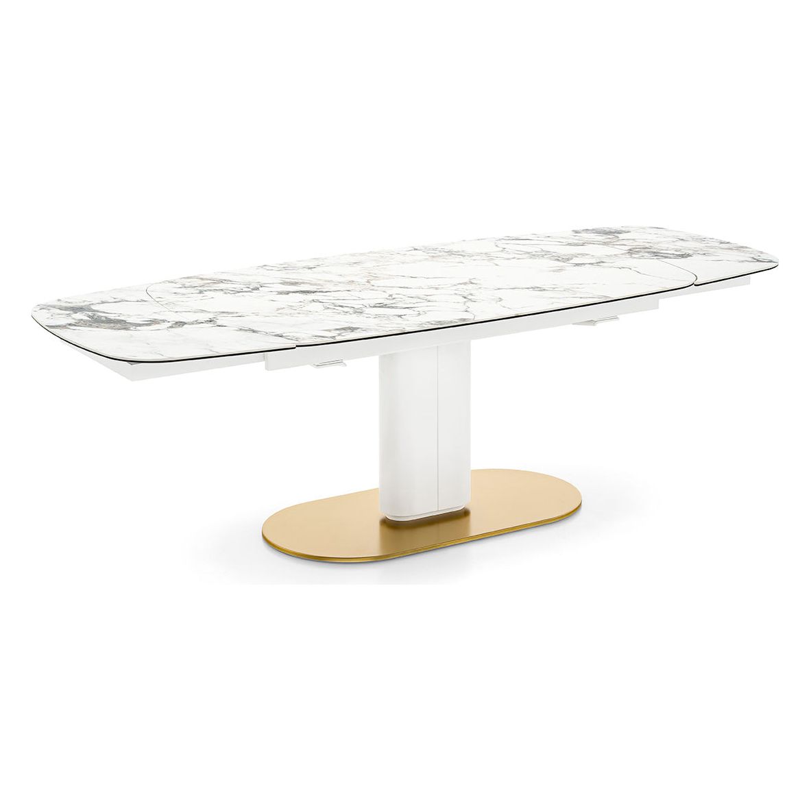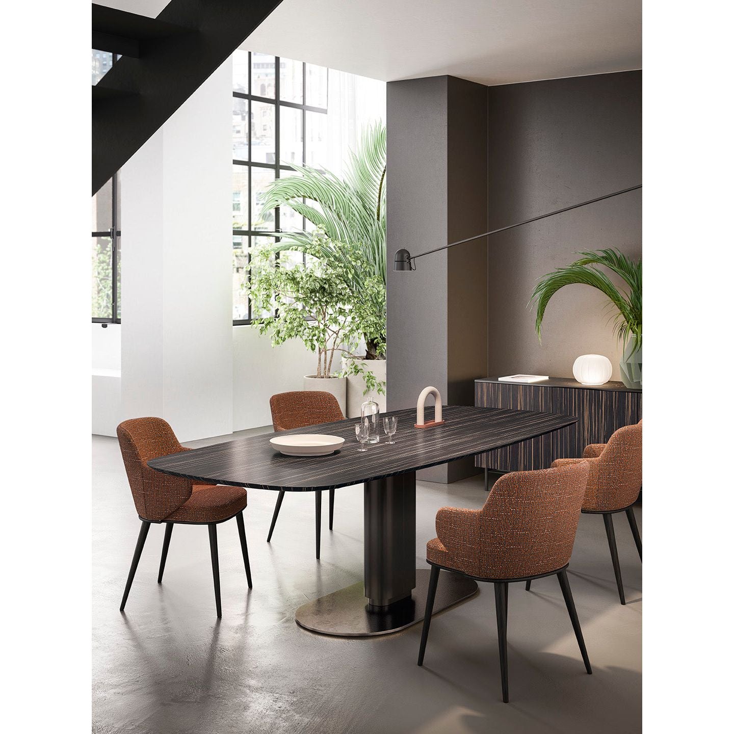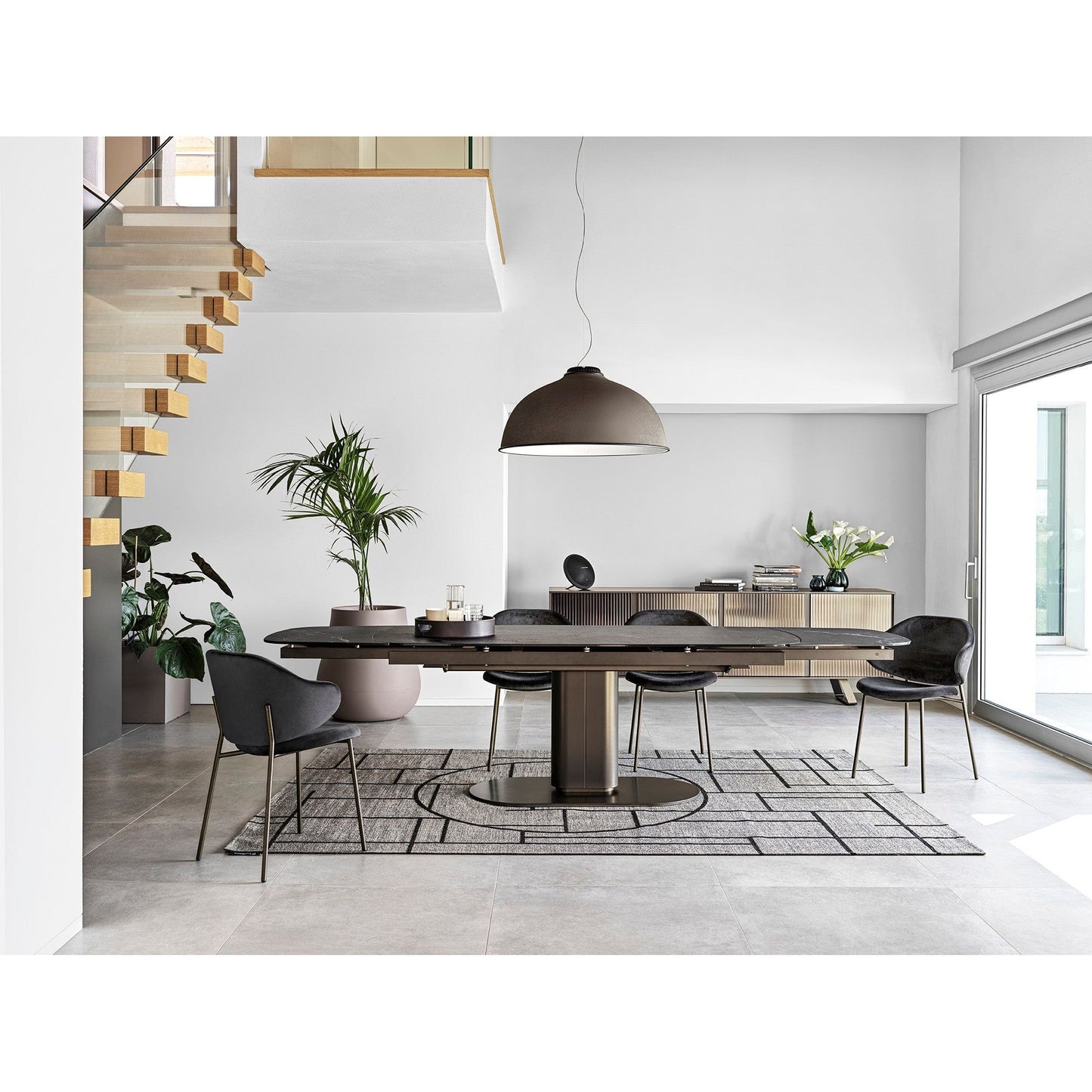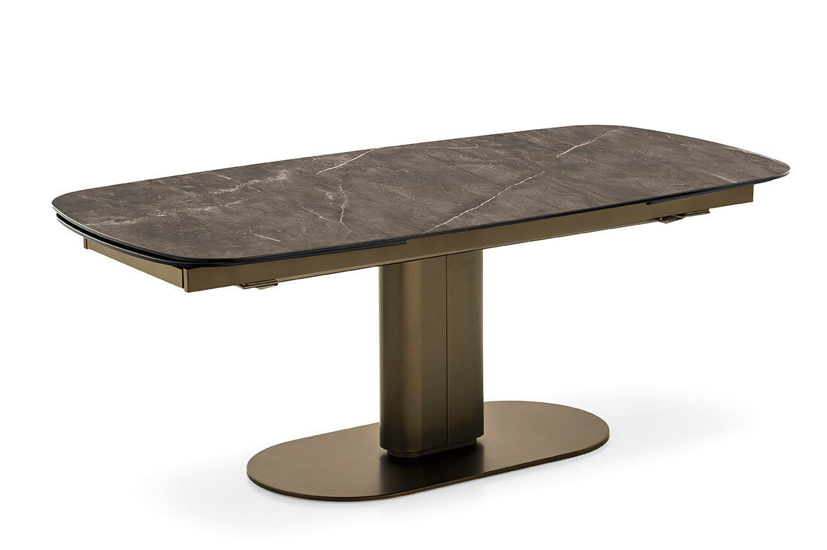 CAMEO is an extendable table with a sharply defined oval silhouette which imbues it with a powerful personality and not only provides stability but allows the space beneath the top to be used to the utmost. Made from coated metal, the central column supports the various types of tops; a metal/wood combination is invariably refined whereas the mixture of metal and ceramic with a marble effect creates a playful contrast between cold and warm materials and is edgily modern.