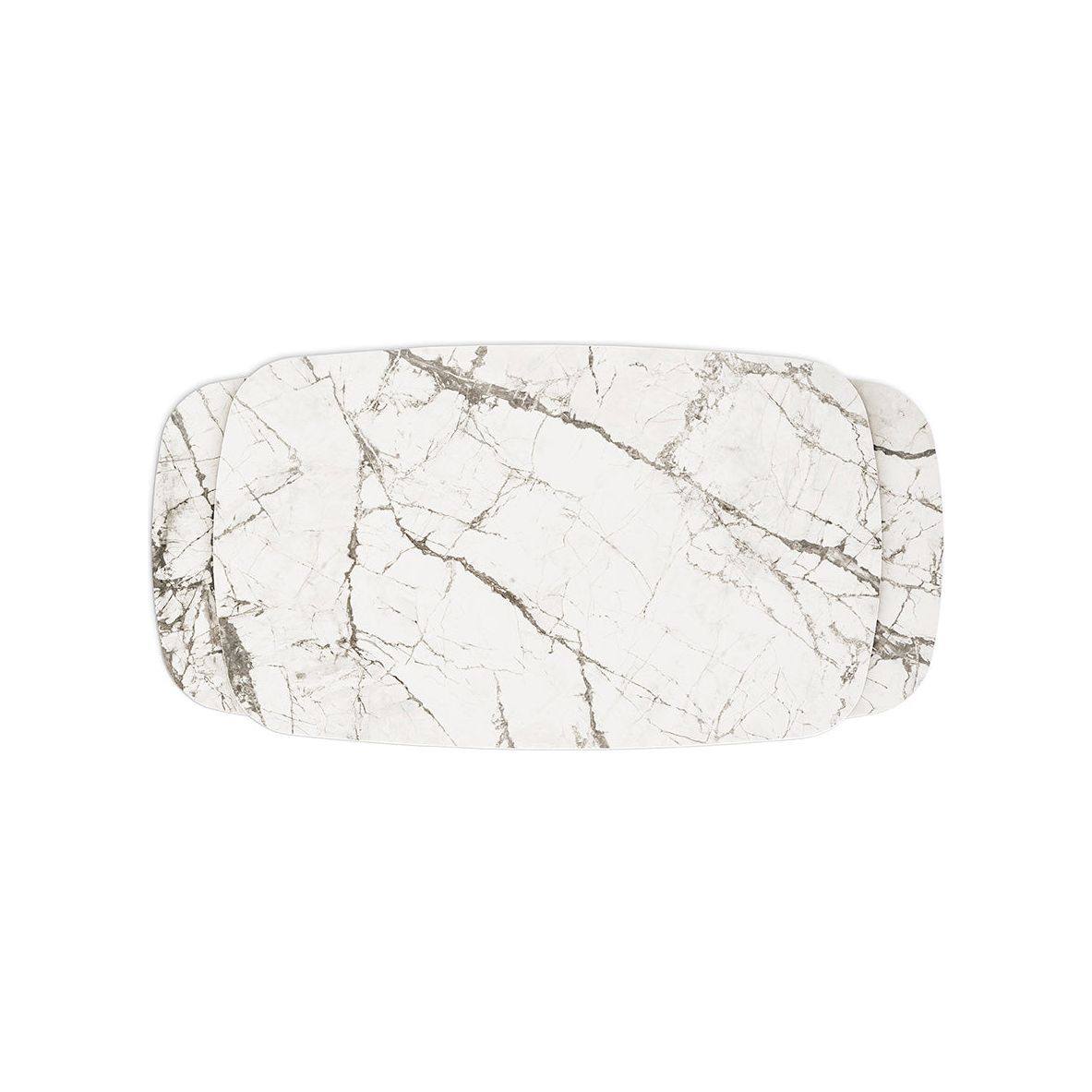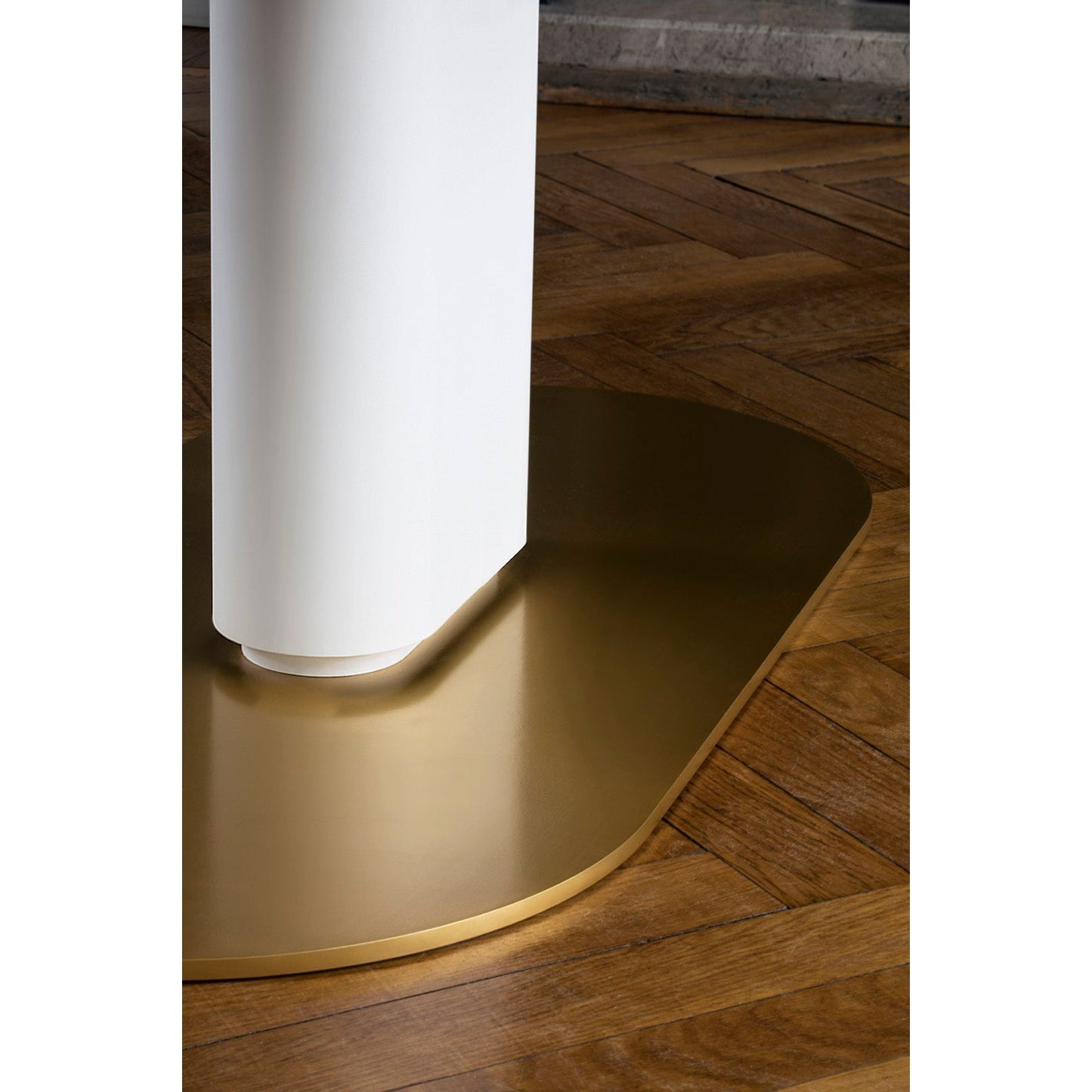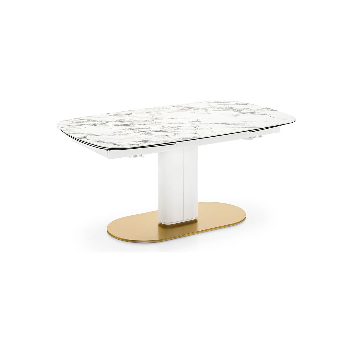 CAMEO is an extendable table with a sharply defined oval silhouette which imbues it with a powerful personality and not only provides stability but allows the space beneath the top to be used to the utmost. Made from coated metal, the central column supports the various types of tops; a metal/wood combination is invariably refined whereas the mixture of metal and ceramic with a marble effect creates a playful contrast between cold and warm materials and is edgily modern.