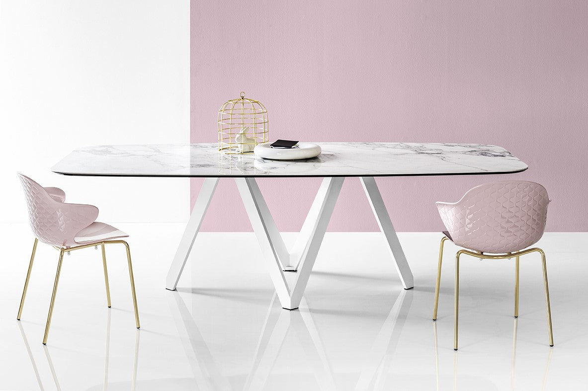 The CARTESIO table boasts elegant, iconic lines characterised by an original weight-bearing frame in painted metal composed of four independent rectangular "V" elements.