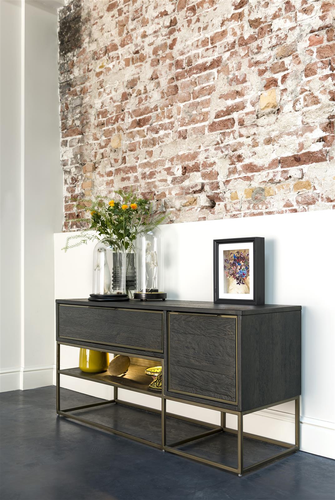 The versatile CITY collection is available to order in "Railway brown" with black metal accents and legs or in the "Castle anthracite" with metal accents and legs in champagne gold. Each of the pieces are hand brushed to give you that industrial feel along with LED lighting and soft closing doors and drawers. This colour is Castle anthracite with champage gold.