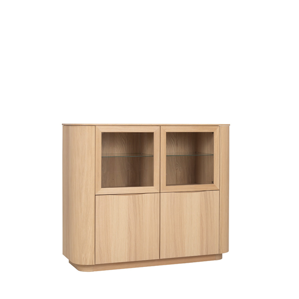 The Collum table with its nicely curved column bases is an iconic design second to none. The fixed table top with solid edges has a smart integrated storage facility for extension leaves at each end and can be ordered with one or two extension leaves matching the table top.The Collum sideboards, highboards and display cabinets represent a comprehensive range of cabinets in a soft organic design. All cabinets have a drinks/storage compartment on both sides with curved wooden doors fitted with a magnetic catch. The plinth of the cabinets is with adjustable feet. All doors and drawers are with soft-closing and the glass doors with push-release. The glass cabinets can be ordered with LED lights with sensor and dimmer. Contact us if you wish to order with this feature.
