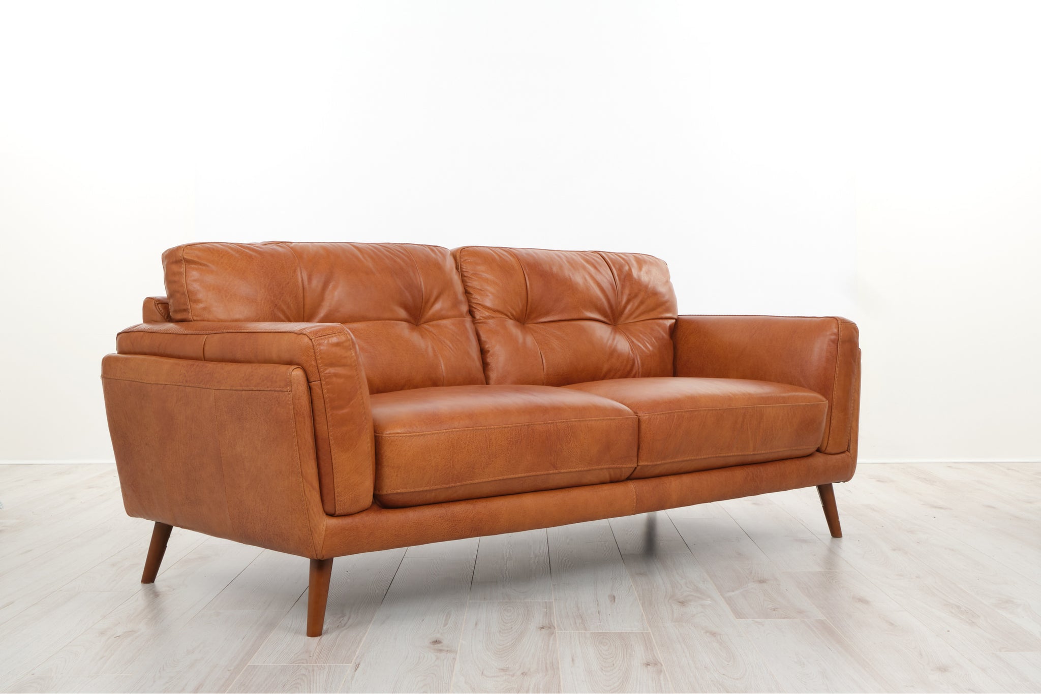 Simple yet sophisticated, the retro design of the Fellini pairs ample proportions and angled legs for an effortlessly inviting collection. Available to order in leather and fabric. For 50+ options please call in store to browse throught our colour options. our stocked colour is in cat30 cognac leather with walnut leg.