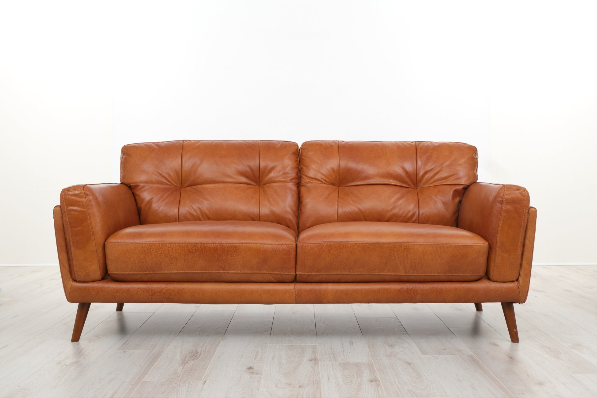 Simple yet sophisticated, the retro design of the Fellini pairs ample proportions and angled legs for an effortlessly inviting collection. Available to order in leather and fabric. For 50+ options please call in store to browse throught our colour options. our stocked colour is in cat30 cognac leather with walnut leg.