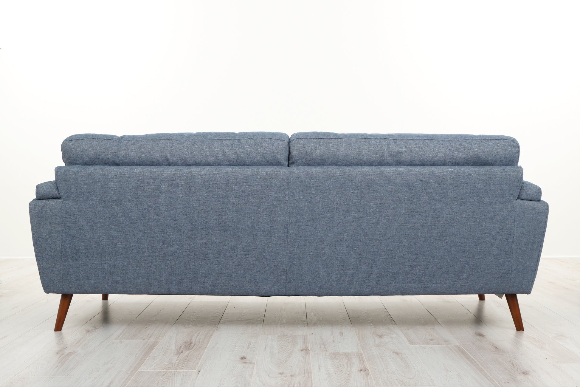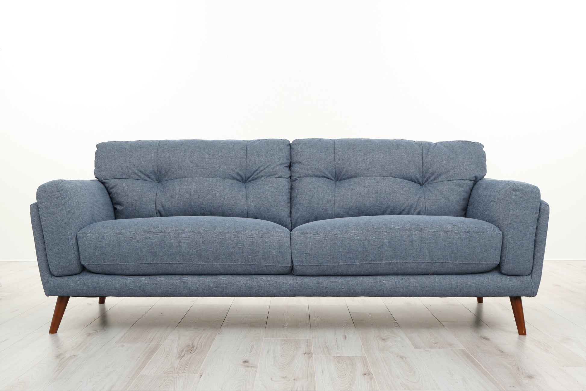 Simple yet sophisticated, the retro design of the Fellini pairs ample proportions and angled legs for an effortlessly inviting collection. Available to order in leather and fabric. For 50+ options please call in store to browse throught our colour options. our stocked colour is in urban denim blue with walnut leg.