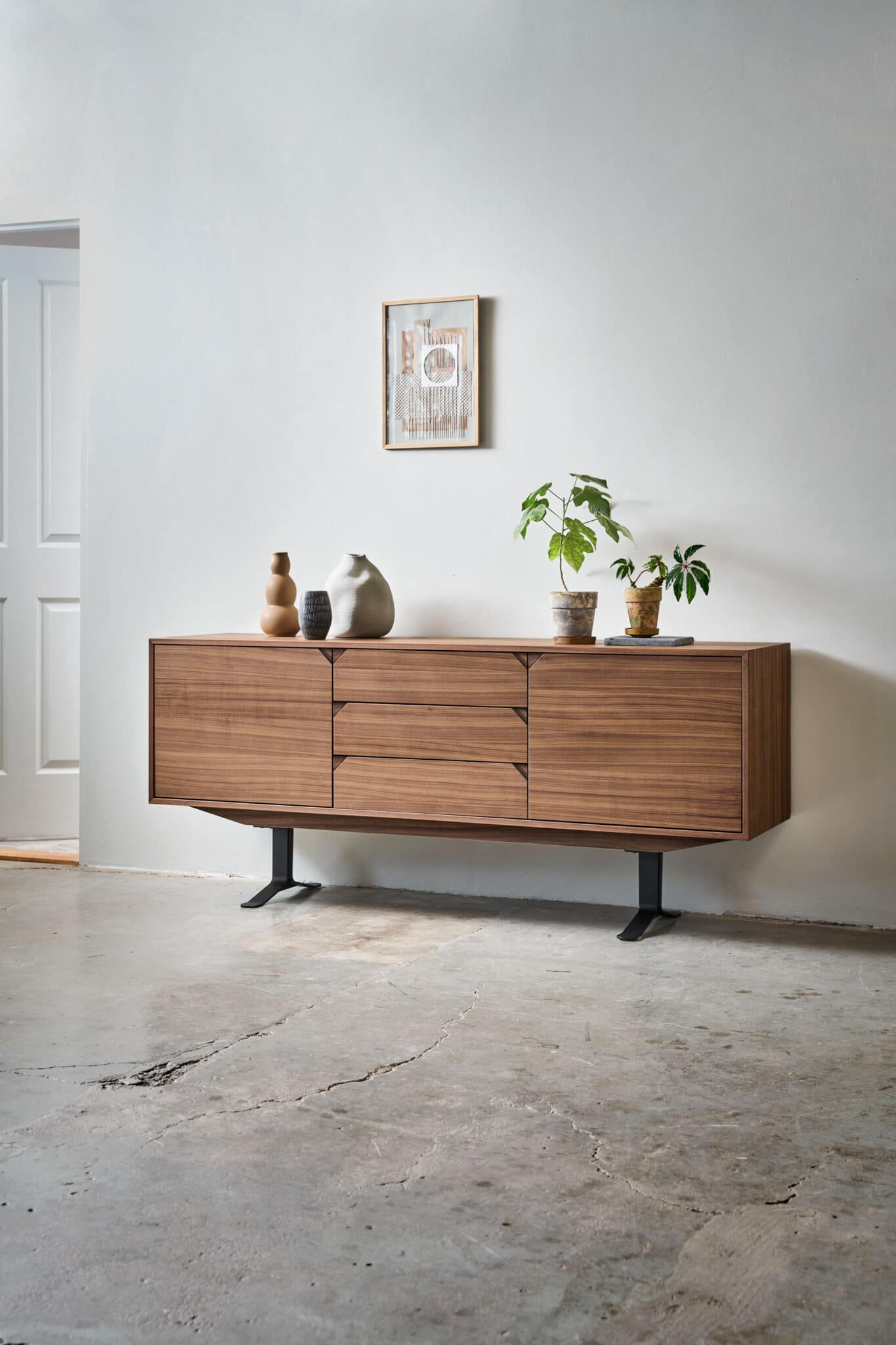 The elegant, iconic design is what made the Fusion table win the German Design Award Special 2021.The beautifully boat shaped top in Intarsia veneer in an asymmetrical, diagonal pattern in walnut. Can be ordered as a fixed top or with either 1 or 2 extension leaves with the same veneer as the tabletop. The large version of 220 cm can also be ordered with a smart storage drawer for the extension leaves fitted under the tabletop. The elegant legs have a black metal centre which can be veneered in the same wood as the tabletop or just black. The sideboards and highboards of the Fusion range are available with matching fronts in the striking Intarsia veneer, straight veneer or one of the beautiful laminates. All doors and drawers are soft-closing and shelves are adjustable.