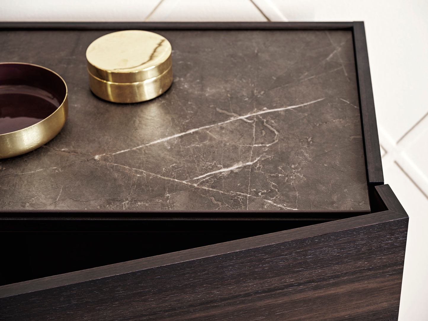 The HORIZON wooden cabinet has two central doors with upper drawer and two side doors. The central compartments are accessed through the push-pull opening mechanism. All the compartments are equipped with a transparent tempered glass shelf. The top, with raised edges, is further decorated with tempered glass. Rectangular chrome-plated metal base.