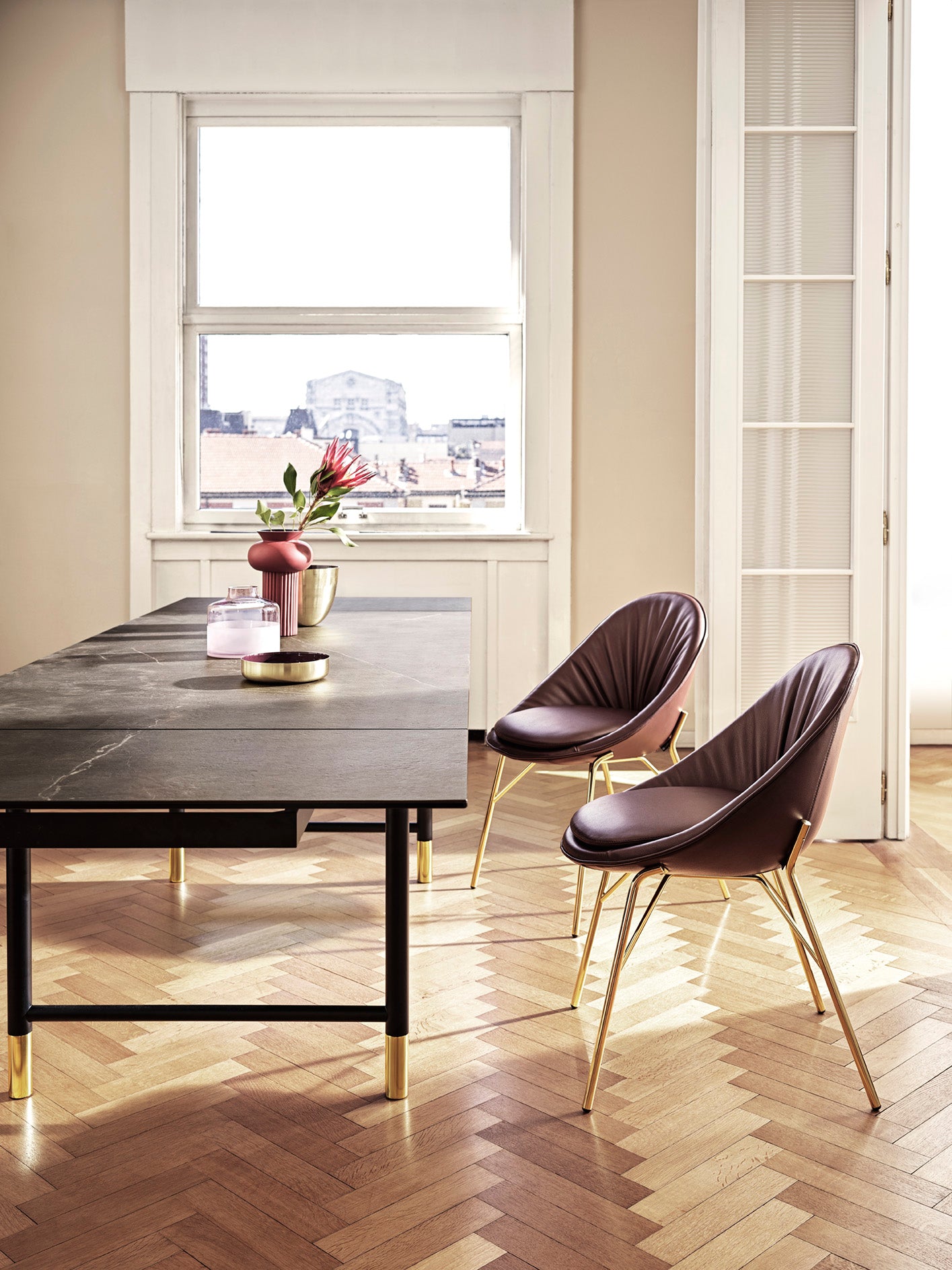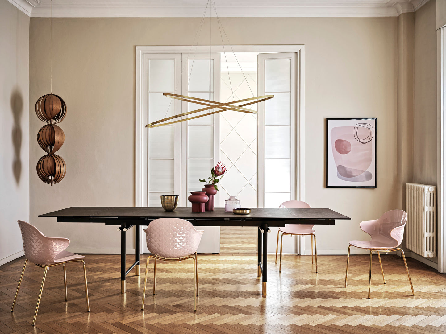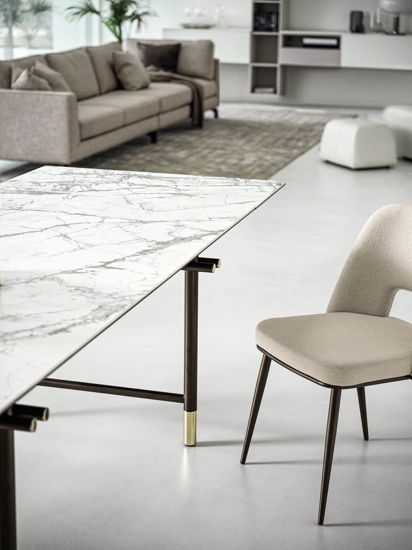 MONOGRAM rests on a minimalist base consisting of a matt coated metal tube with round cross-section, in stark contrast to the bright shiny feet that can be combined with ease. The tops are always made of ceramic with various finishes. MONOGRAM can be ideally fitted in large dining rooms thanks to its two independent extensions. Perfectly integrated into the structure’s design, they slide on aluminium guides matching with the base.