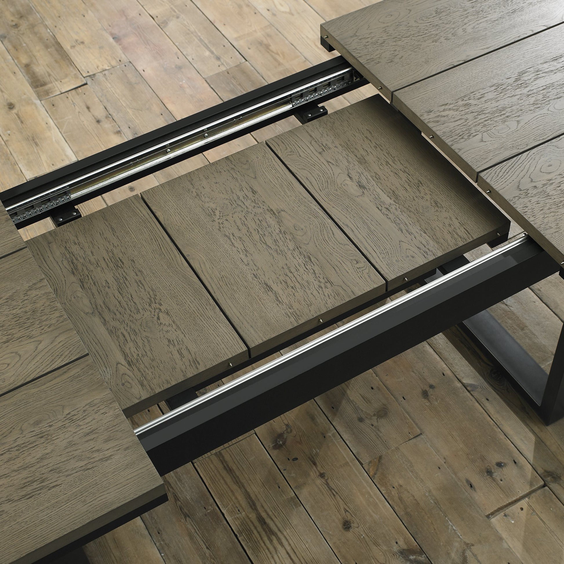 Munich is an industrial and on-trend mixed media dining range incorporating a bold and striking mix of wire brushed weathered oak with ebonised accent detailing and black powder coated metal frames. Cantilever chairs with meticulously polished frames and precision cut joints using the latest technology are available in a dark mottled grey fabric featuring a bold square pattern stitch detail with a handle in the back and superior glides on the base for ease of manoeuvre. Design features including end grain detailing, planking effect on table tops and cabinet facia and a distinctive modular open display unit combine with advanced constructional techniques and high end fittings, including BLUM soft close drawer runners, to create a compelling contemporary fashion statement offering functionality with premium build quality.
