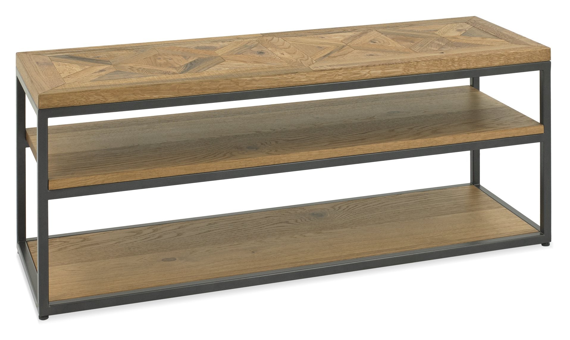 Newton is a striking design combining saw cut oak marquetry tops with a 'peppercorn' finished wire brushed oak veneered frame and a welded black powder coated metal base, giving it an on trend industrial edge. Each of the hand-crafted pattern tops are wire brushed and distressed to give a rustic look and tactile feel, making the most of the beautiful and varied grain of oak.