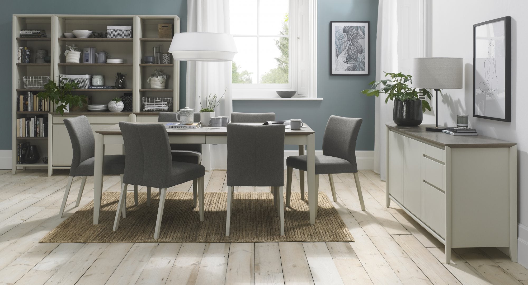 Riga is a strikingly contemporary, modular-based collection of dining, living room & home office furniture that offers flexibility and practicality in tune with today's lifestyles. Made with a combination of attractive grey washed oak tops contrasting with soft grey pigment frames, this range is hugely versatile, offering three sizes of tables, ultramodern low back slat and upholstered chairs as well as a more standard high back slat chair, in fabric or faux leather options. The design features curved tapering legs that meet the patterned tops in a three way mitre joint, boasting a real technical prowess by way of precise CNC machining, neat finishes and general technical excellence to create a complex simplicity! Inspired by the needs of open plan living, it allows you to create functional combinations of shelf units and cabinet pieces that fit seamlessly within dining, lounge or home office settings. The Riga collection is the perfect solution for the demands of modern-day living.