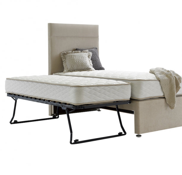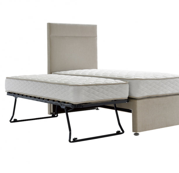 Our TIVOLI guest bed from Respa is ideal for a kid's bedroom or a spare room. It's perfect for when you have extra people staying over with the bed underneath sliding out effortlessly. The set includes the mattress, base and underbed with sliding metal base + mattress. Made Using high-quality FSC Certified Scandinavian timber from sustainably managed forests. Call in store to see all the fabric options available to order from.