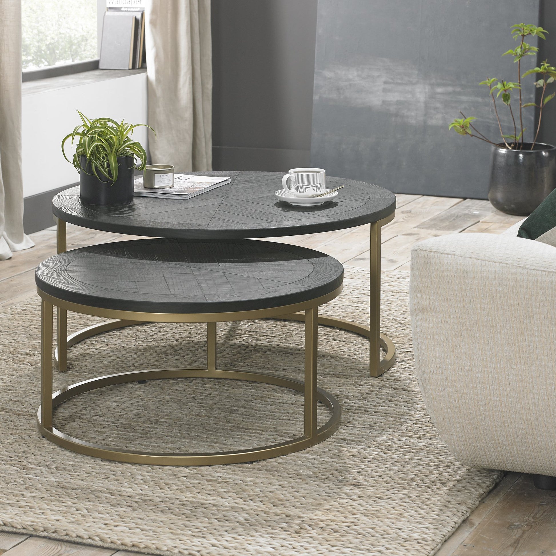 Add glamour and make a statement in your home with the Chevron Peppercorn ash occasional range. Saw cut ash marquetry tops are finished in a rich peppercorn coloured stain and married with a burnished satin brass metal base to give this range a chic and luxurious feel. Each of the hand-crafted boarded chevron patterned tops are wire brushed and distressed to give an authentic look and tactile feel, making the most of the beautiful and varied grains of ash. The radiused tops and bases combine beautifully with the linear frames to create a contemporary and slightly eclectic blend.